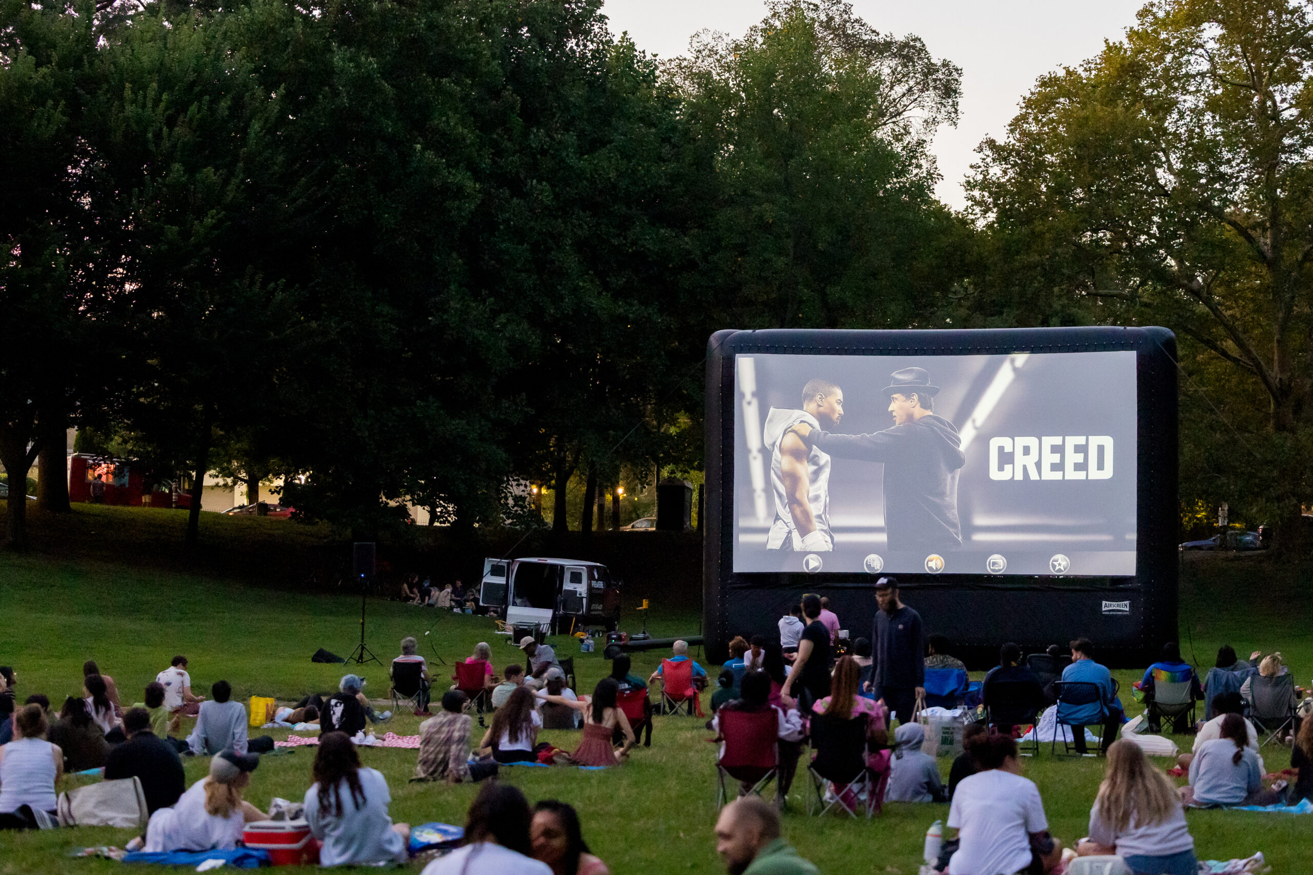 A large group of people sitting on the ground, watching a movie on a big screen during Movies at Clark Park